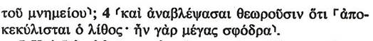 A szógyökér a „kúlió” # 617. κυλίω, 617. ἀποκυλίω (apokulió) jelentése gördít, görget, hengerít (valamit).De nem jelent elmozdítást (valahonnan), vagy kiemelést, elemelést(valamiből).- A kockaalakú zárókövek közül igen sok két síkú volt, a belső felén dugószerű kiemelkedéssel. nemlehetett elfordítással-görgetéssel eltávolítani egy sír bejáratáról, csak kihúzás, és kiemelés után. Igy ezt a műveletet nem lehetett gördítés szóval jellemezni. A Görög textusban grammatikával ellátva találjuk ezt a szót a fentiek szerint: