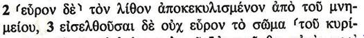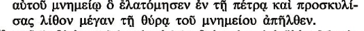 János apostol volt az, aki Péter apostollal együtt, – elsőként – a tanítványok közül látta az üres sírt felnyitva. Azonban az ő evangéliumi leírása több mint 60 év után a kisázsiai Efezusban készült. Ő egyik görög tanítványának, Pápiásznak diktálta az evangéliumát. Ott nem szerepel az „elgördítés”szó, hanem a „felemelni,- és elvinni, az ,,,airó,,,szó szerepel grammatikával ellátva,: „Hérmenon,,, = airó,+ perf. part. pass. Az igaz, hogy egy helyére gördített sírzárókövet emelni, és gördíteni is kellett egyzárt sír kinyitásához. Egy kocka formájú zárókövet nem lehet „gördíteni”! Aszinoptikus evangéliumokban szereplő kifejezés egyértelműen „el” illetve „rágördítést” jelent. Ez a görög szó semmiképen nem jelent emelést, vagy „valahová emelést”. A klasszikus görögben is, a Koinyé-ban is, – a Jézuskori görögben – a szógyökér ”kör”-görbe,-kerek – és sok rokon kifejezés! János apostol görög anyanyelvű írnoka úgy írta le, ahogy elképzelte az elmondottakat.